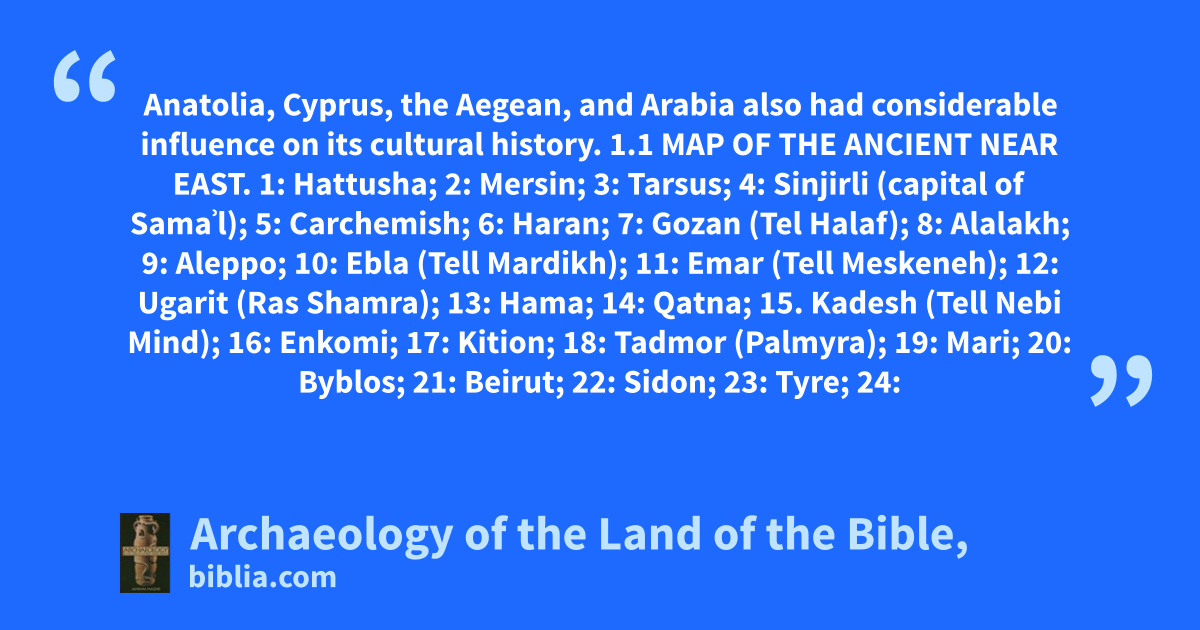 Anatolia, Cyprus, the Aegean, and Arabia also had considerable influence on its cultural history. 1.1 MAP OF THE ANCIENT NEAR EAST. 1: Hattusha; 2: Mersin; 3: Tarsus; 4: Sinjirli (capital of Samaʾl); 5: Carchemish; 6: Haran; 7: Gozan (Tel Halaf); 8: Alalakh; 9: Aleppo; 10: Ebla (Tell Mardikh); 11: Emar (Tell Meskeneh); 12: Ugarit (Ras Shamra); 13: Hama; 14: Qatna; 15. Kadesh (Tell Nebi Mind); 16: Enkomi; 17: Kition; 18: Tadmor (Palmyra); 19: Mari; 20: Byblos; 21: Beirut; 22: Sidon; 23: Tyre; 24: