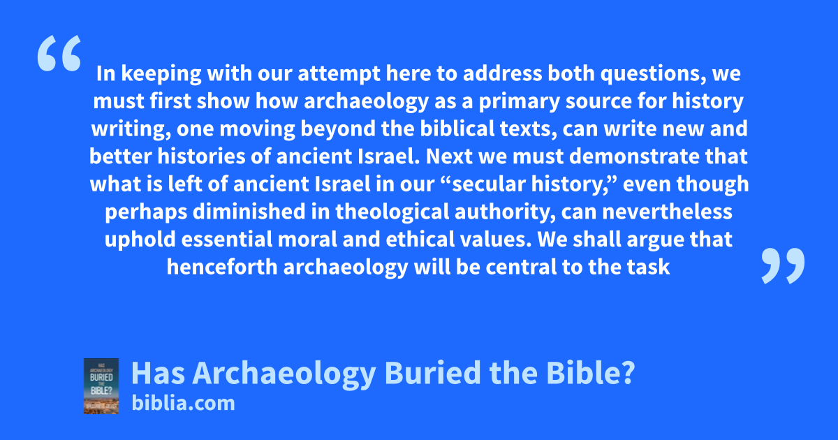 In keeping with our attempt here to address both questions, we must first show how archaeology as a primary source for history writing, one moving beyond the biblical texts, can write new and better histories of ancient Israel. Next we must demonstrate that what is left of ancient Israel in our “secular history,” even though perhaps diminished in theological authority, can nevertheless uphold essential moral and ethical values. We shall argue that henceforth archaeology will be central to the task