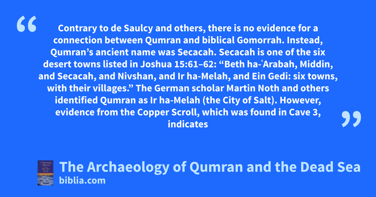 Contrary to de Saulcy and others, there is no evidence for a connection between Qumran and biblical Gomorrah. Instead, Qumran’s ancient name was Secacah. Secacah is one of the six desert towns listed in Joshua 15:61–62: “Beth ha-ʿArabah, Middin, and Secacah, and Nivshan, and Ir ha-Melah, and Ein Gedi: six towns, with their villages.” The German scholar Martin Noth and others identified Qumran as Ir ha-Melah (the City of Salt). However, evidence from the Copper Scroll, which was found in Cave 3, indicates