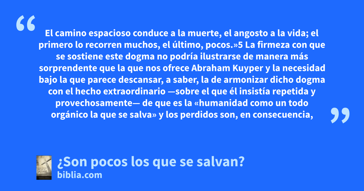 El camino espacioso conduce a la muerte, el angosto a la vida; el primero lo recorren muchos, el último, pocos.»5 La firmeza con que se sostiene este dogma no podría ilustrarse de manera más sorprendente que la que nos ofrece Abraham Kuyper y la necesidad bajo la que parece descansar, a saber, la de armonizar dicho dogma con el hecho extraordinario —sobre el que él insistía repetida y provechosamente— de que es la «humanidad como un todo orgánico la que se salva» y los perdidos son, en consecuencia,