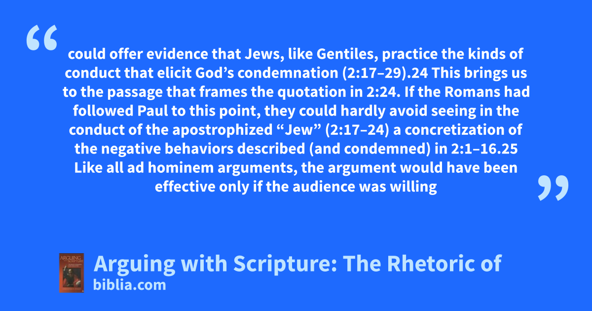 could offer evidence that Jews, like Gentiles, practice the kinds of conduct that elicit God’s condemnation (2:17–29).24 This brings us to the passage that frames the quotation in 2:24. If the Romans had followed Paul to this point, they could hardly avoid seeing in the conduct of the apostrophized “Jew” (2:17–24) a concretization of the negative behaviors described (and condemned) in 2:1–16.25 Like all ad hominem arguments, the argument would have been effective only if the audience was willing