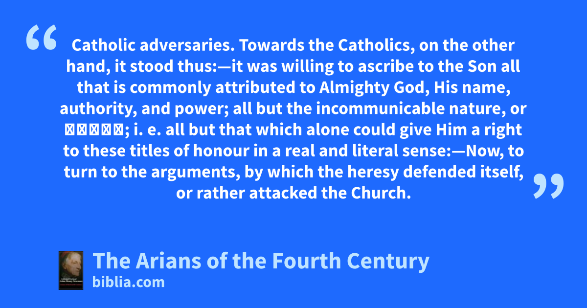 Catholic adversaries. Towards the Catholics, on the other hand, it stood thus:—it was willing to ascribe to the Son all that is commonly attributed to Almighty God, His name, authority, and power; all but the incommunicable nature, or οὐσία; i. e. all but that which alone could give Him a right to these titles of honour in a real and literal sense:—Now, to turn to the arguments, by which the heresy defended itself, or rather attacked the Church.