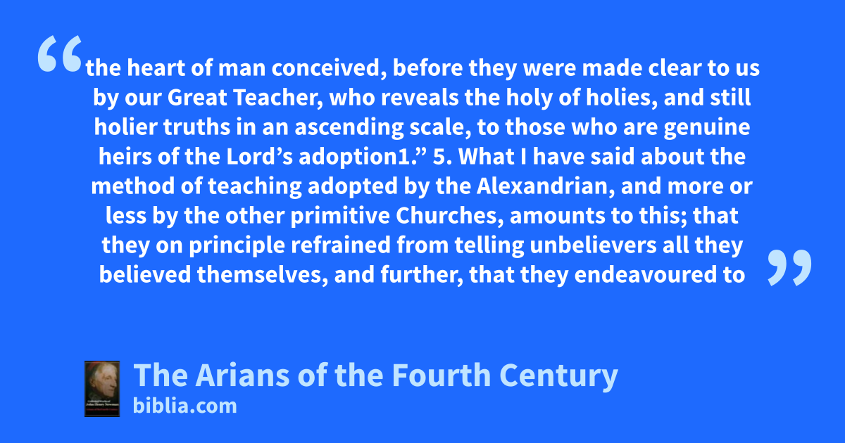 the heart of man conceived, before they were made clear to us by our Great Teacher, who reveals the holy of holies, and still holier truths in an ascending scale, to those who are genuine heirs of the Lord’s adoption1.” 5. What I have said about the method of teaching adopted by the Alexandrian, and more or less by the other primitive Churches, amounts to this; that they on principle refrained from telling unbelievers all they believed themselves, and further, that they endeavoured to