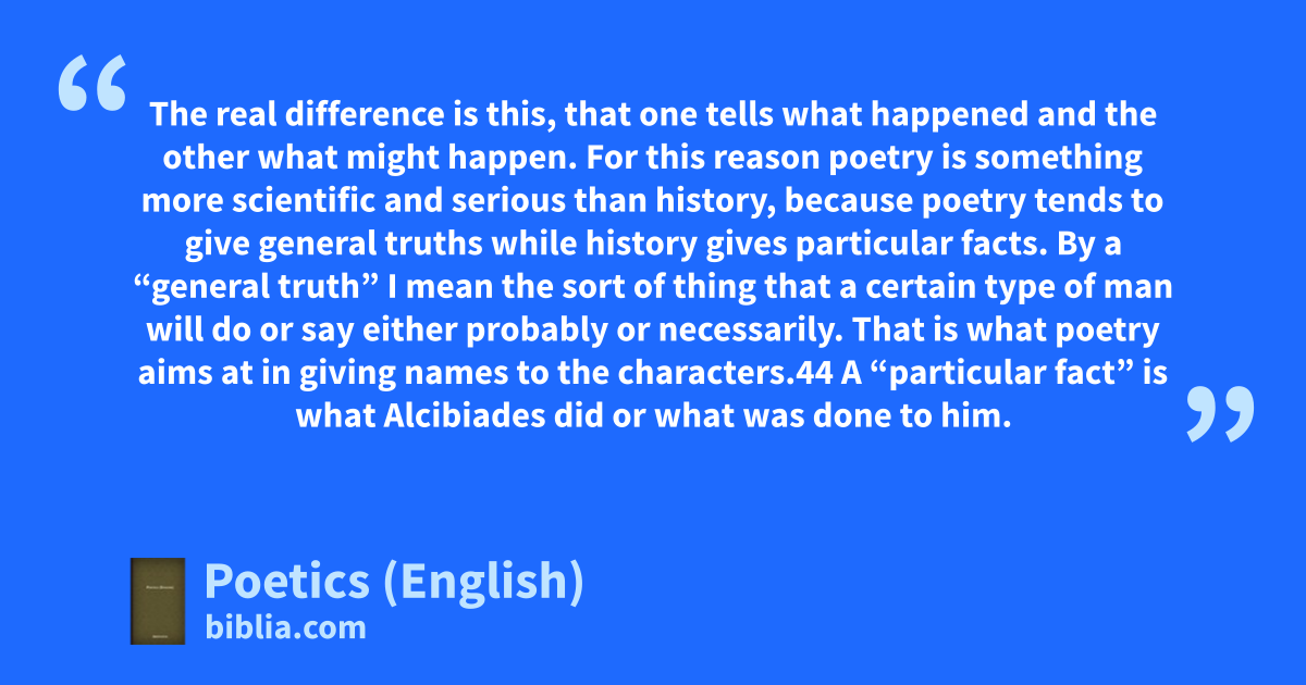 The real difference is this, that one tells what happened and the other what might happen. For this reason poetry is something more scientific and serious than history, because poetry tends to give general truths while history gives particular facts. By a “general truth” I mean the sort of thing that a certain type of man will do or say either probably or necessarily. That is what poetry aims at in giving names to the characters.44 A “particular fact” is what Alcibiades did or what was done to him.