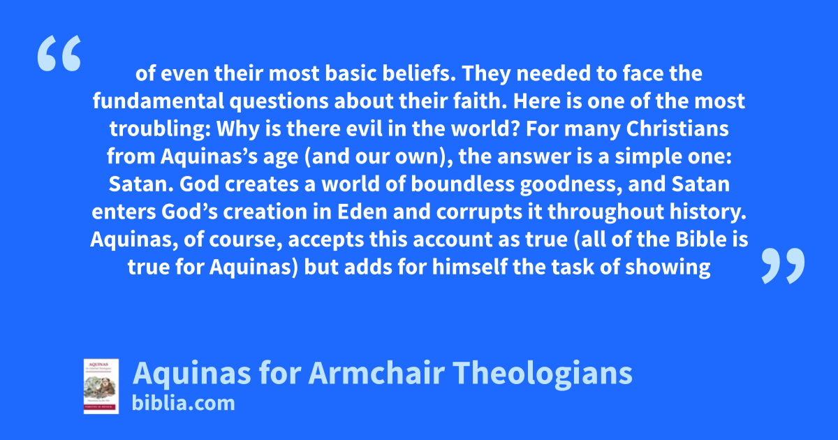 of even their most basic beliefs. They needed to face the fundamental questions about their faith. Here is one of the most troubling: Why is there evil in the world? For many Christians from Aquinas’s age (and our own), the answer is a simple one: Satan. God creates a world of boundless goodness, and Satan enters God’s creation in Eden and corrupts it throughout history. Aquinas, of course, accepts this account as true (all of the Bible is true for Aquinas) but adds for himself the task of showing