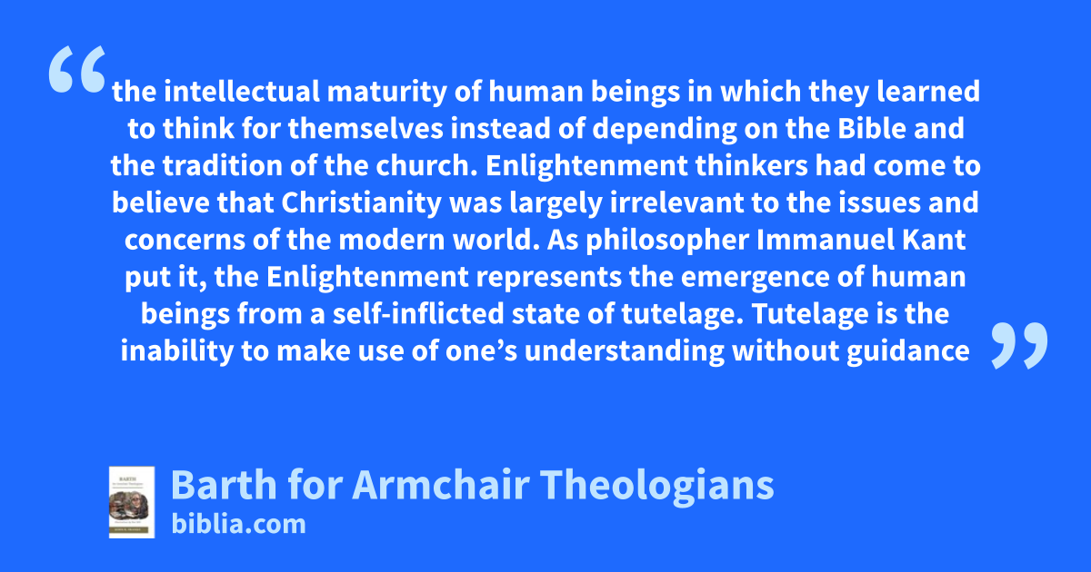 the intellectual maturity of human beings in which they learned to think for themselves instead of depending on the Bible and the tradition of the church. Enlightenment thinkers had come to believe that Christianity was largely irrelevant to the issues and concerns of the modern world. As philosopher Immanuel Kant put it, the Enlightenment represents the emergence of human beings from a self-inflicted state of tutelage. Tutelage is the inability to make use of one’s understanding without guidance