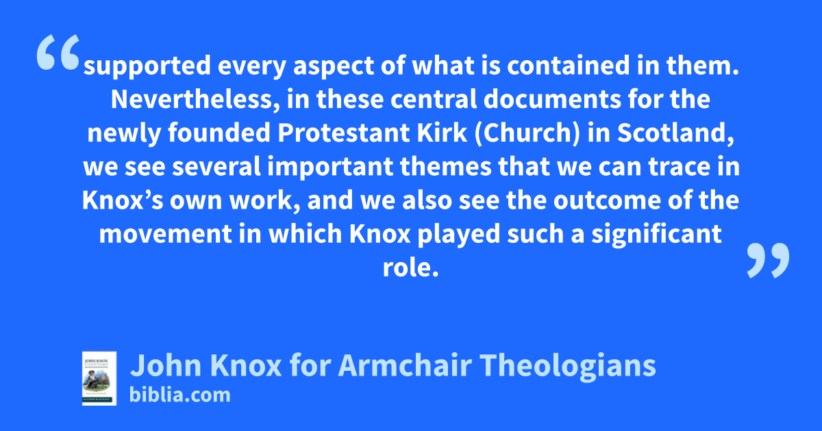 supported every aspect of what is contained in them. Nevertheless, in these central documents for the newly founded Protestant Kirk (Church) in Scotland, we see several important themes that we can trace in Knox’s own work, and we also see the outcome of the movement in which Knox played such a significant role.