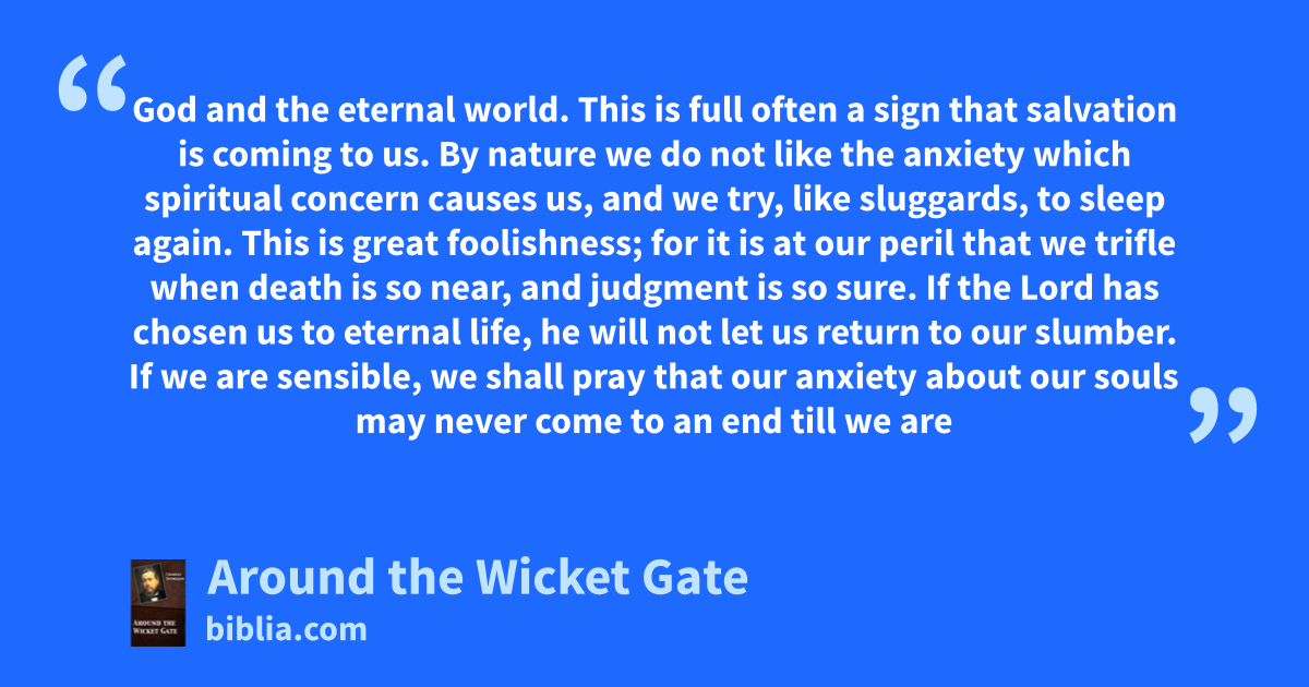 God and the eternal world. This is full often a sign that salvation is coming to us. By nature we do not like the anxiety which spiritual concern causes us, and we try, like sluggards, to sleep again. This is great foolishness; for it is at our peril that we trifle when death is so near, and judgment is so sure. If the Lord has chosen us to eternal life, he will not let us return to our slumber. If we are sensible, we shall pray that our anxiety about our souls may never come to an end till we are