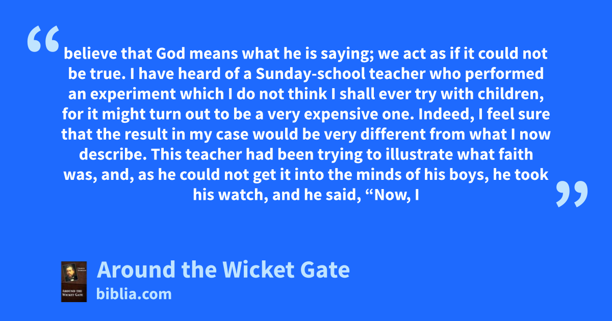 believe that God means what he is saying; we act as if it could not be true. I have heard of a Sunday-school teacher who performed an experiment which I do not think I shall ever try with children, for it might turn out to be a very expensive one. Indeed, I feel sure that the result in my case would be very different from what I now describe. This teacher had been trying to illustrate what faith was, and, as he could not get it into the minds of his boys, he took his watch, and he said, “Now, I