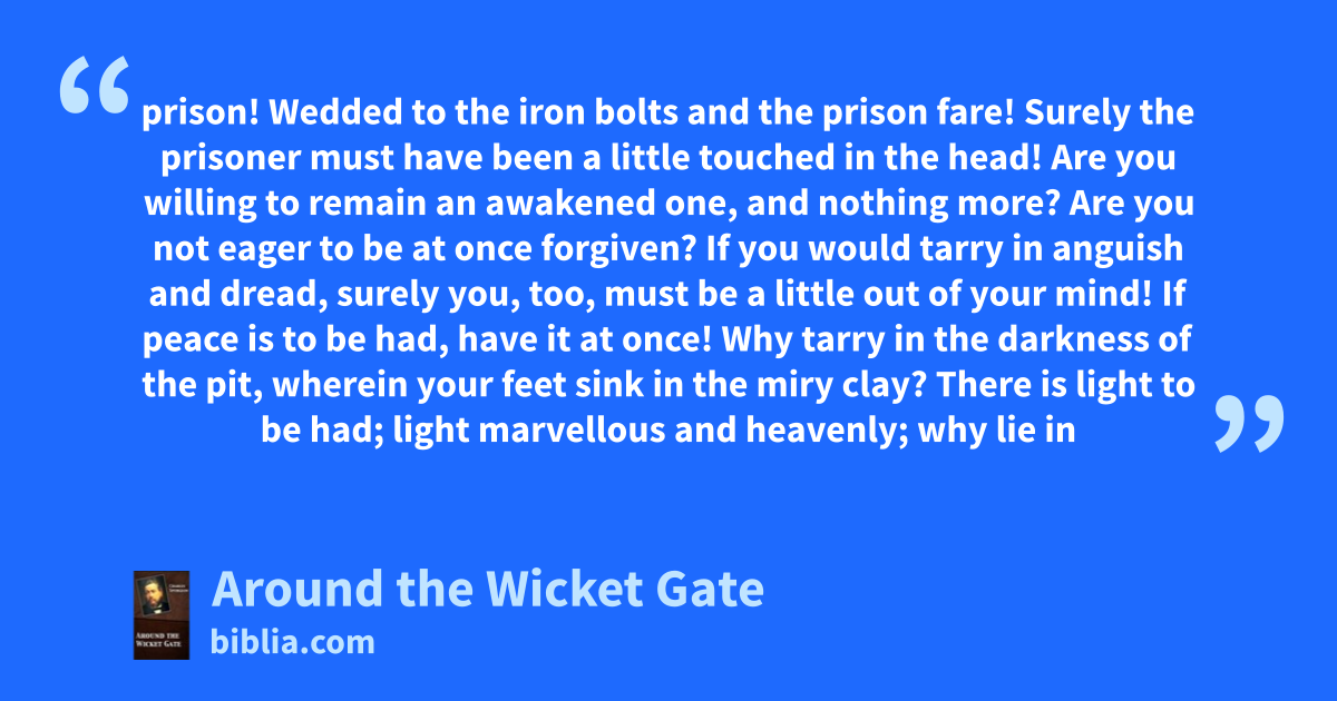 prison! Wedded to the iron bolts and the prison fare! Surely the prisoner must have been a little touched in the head! Are you willing to remain an awakened one, and nothing more? Are you not eager to be at once forgiven? If you would tarry in anguish and dread, surely you, too, must be a little out of your mind! If peace is to be had, have it at once! Why tarry in the darkness of the pit, wherein your feet sink in the miry clay? There is light to be had; light marvellous and heavenly; why lie in