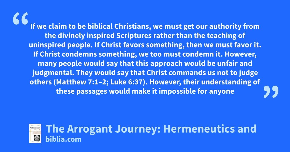 If we claim to be biblical Christians, we must get our authority from the divinely inspired Scriptures rather than the teaching of uninspired people. If Christ favors something, then we must favor it. If Christ condemns something, we too must condemn it. However, many people would say that this approach would be unfair and judgmental. They would say that Christ commands us not to judge others (Matthew 7:1–2; Luke 6:37). However, their understanding of these passages would make it impossible for anyone