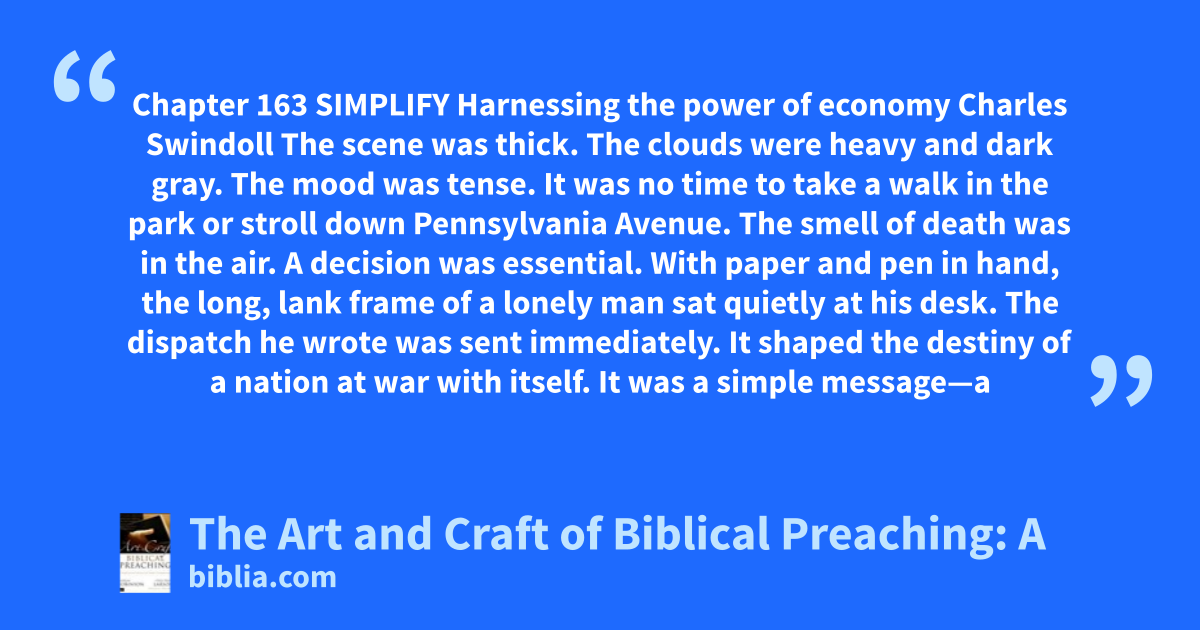 Chapter 163 SIMPLIFY Harnessing the power of economy Charles Swindoll The scene was thick. The clouds were heavy and dark gray. The mood was tense. It was no time to take a walk in the park or stroll down Pennsylvania Avenue. The smell of death was in the air. A decision was essential. With paper and pen in hand, the long, lank frame of a lonely man sat quietly at his desk. The dispatch he wrote was sent immediately. It shaped the destiny of a nation at war with itself. It was a simple message—a