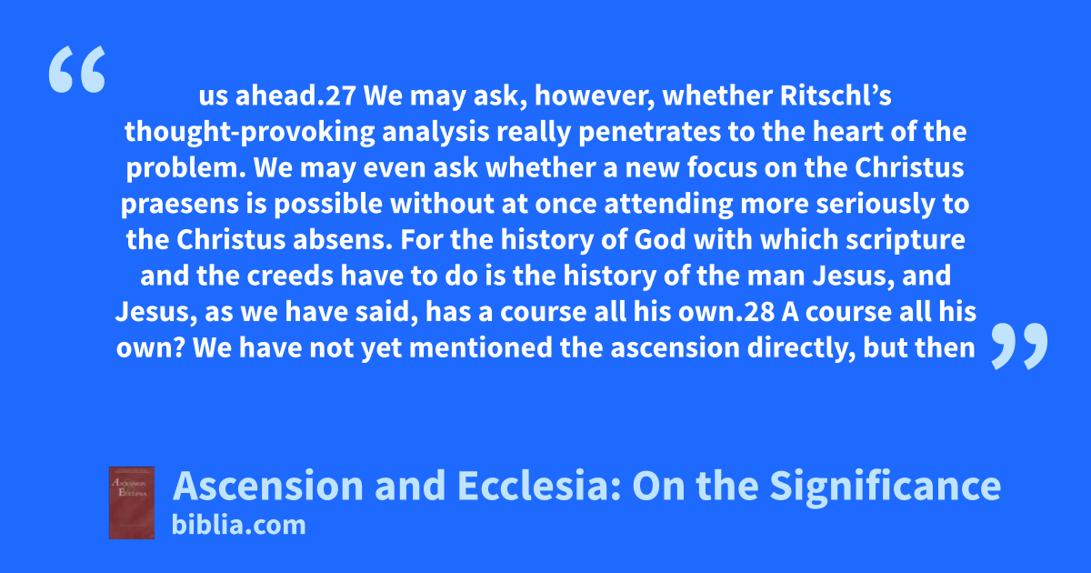 us ahead.27 We may ask, however, whether Ritschl’s thought-provoking analysis really penetrates to the heart of the problem. We may even ask whether a new focus on the Christus praesens is possible without at once attending more seriously to the Christus absens. For the history of God with which scripture and the creeds have to do is the history of the man Jesus, and Jesus, as we have said, has a course all his own.28 A course all his own? We have not yet mentioned the ascension directly, but then