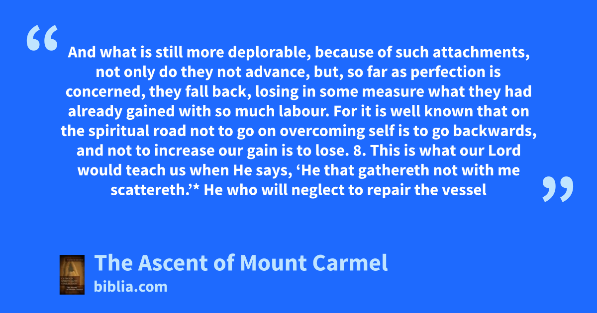 And what is still more deplorable, because of such attachments, not only do they not advance, but, so far as perfection is concerned, they fall back, losing in some measure what they had already gained with so much labour. For it is well known that on the spiritual road not to go on overcoming self is to go backwards, and not to increase our gain is to lose. 8. This is what our Lord would teach us when He says, ‘He that gathereth not with me scattereth.’* He who will neglect to repair the vessel