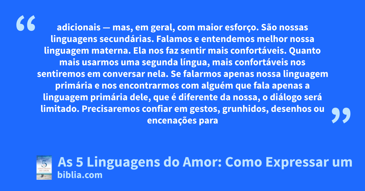 adicionais — mas, em geral, com maior esforço. São nossas linguagens secundárias. Falamos e entendemos melhor nossa linguagem materna. Ela nos faz sentir mais confortáveis. Quanto mais usarmos uma segunda língua, mais confortáveis nos sentiremos em conversar nela. Se falarmos apenas nossa linguagem primária e nos encontrarmos com alguém que fala apenas a linguagem primária dele, que é diferente da nossa, o diálogo será limitado. Precisaremos confiar em gestos, grunhidos, desenhos ou encenações para