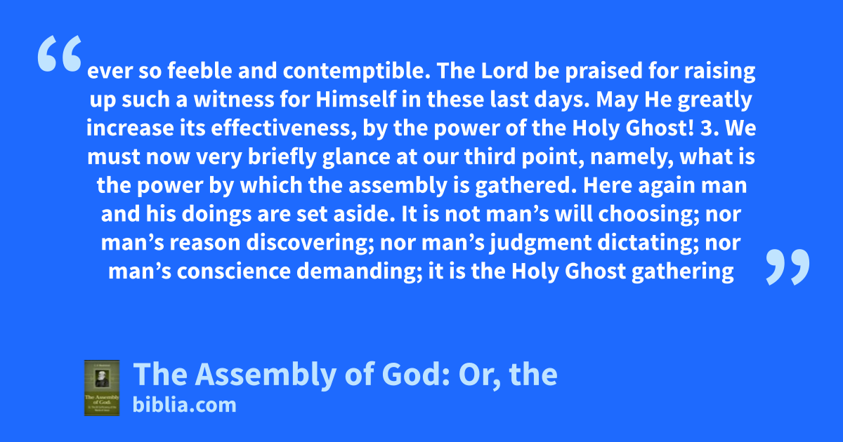 ever so feeble and contemptible. The Lord be praised for raising up such a witness for Himself in these last days. May He greatly increase its effectiveness, by the power of the Holy Ghost! 3. We must now very briefly glance at our third point, namely, what is the power by which the assembly is gathered. Here again man and his doings are set aside. It is not man’s will choosing; nor man’s reason discovering; nor man’s judgment dictating; nor man’s conscience demanding; it is the Holy Ghost gathering