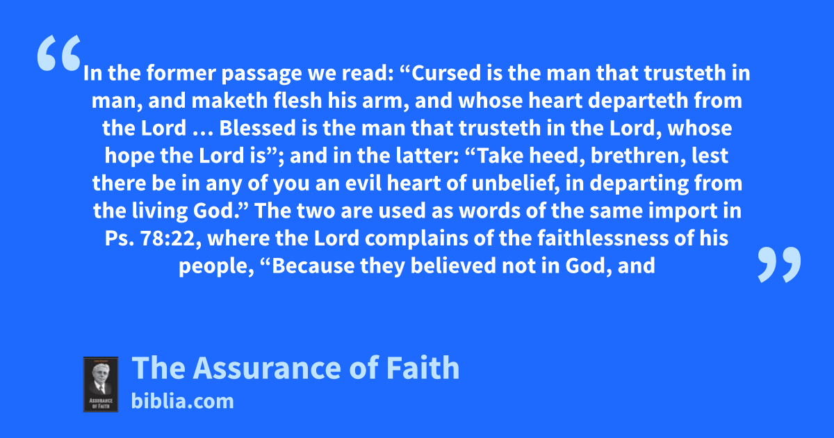 In the former passage we read: “Cursed is the man that trusteth in man, and maketh flesh his arm, and whose heart departeth from the Lord … Blessed is the man that trusteth in the Lord, whose hope the Lord is”; and in the latter: “Take heed, brethren, lest there be in any of you an evil heart of unbelief, in departing from the living God.” The two are used as words of the same import in Ps. 78:22, where the Lord complains of the faithlessness of his people, “Because they believed not in God, and