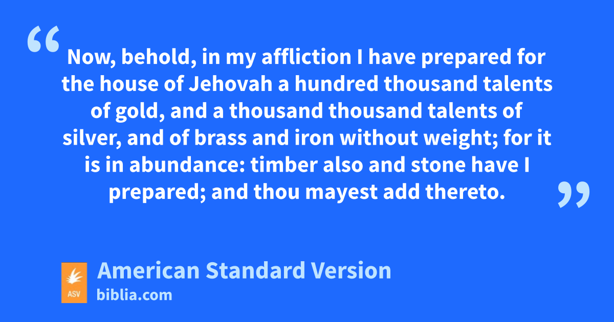 6Then he called for Solomon his son, and charged him to build a house for Jehovah, the God of Israel. 7And David said to Solomon his son, As for me, it was in my heart to build a house unto the name of Jehovah my God. 8But the word of Jehovah came to me, saying, Thou hast shed blood abundantly, and hast made great wars: thou shalt not build a house unto my name, because thou hast shed much blood upon the earth in my sight. 9Behold, a son shall be born to thee, who shall be a man of rest; and I will give him rest from all his enemies round about; for his name shall be Solomon, and I will give peace and quietness unto Israel in his days. 10He shall build a house for my name; and he shall be my son, and I will be his father; and I will establish the throne of his kingdom over Israel for ever. 11Now, my son, Jehovah be with thee; and prosper thou, and build the house of Jehovah thy God, as he hath spoken concerning thee. 12Only Jehovah give thee discretion and understanding, and give thee charge concerning Israel; that so thou mayest keep the law of Jehovah thy God. 13Then shalt thou prosper, if thou observe to do the statutes and the ordinances which Jehovah charged Moses with concerning Israel: be strong, and of good courage; fear not, neither be dismayed. 14Now, behold, in my affliction I have prepared for the house of Jehovah a hundred thousand talents of gold, and a thousand thousand talents of silver, and of brass and iron without weight; for it is in abundance: timber also and stone have I prepared; and thou mayest add thereto. 15Moreover there are workmen with thee in abundance, hewers and workers of stone and timber, and all men that are skilful in every manner of work: 16of the gold, the silver, and the brass, and the iron, there is no number. Arise and be doing, and Jehovah be with thee.
