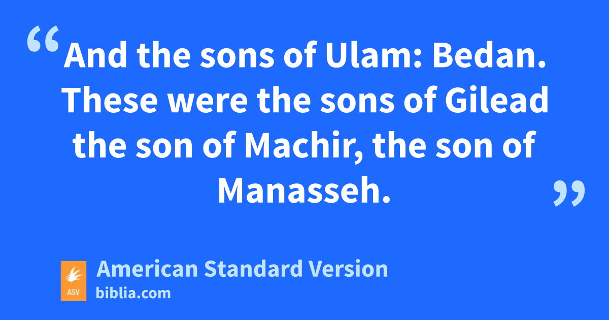14The sons of Manasseh: Asriel, whom his concubine the Aramitess bare: she bare Machir the father of Gilead: 15and Machir took a wife of Huppim and Shuppim, whose sister’s name was Maacah; and the name of the second was Zelophehad: and Zelophehad had daughters. 16And Maacah the wife of Machir bare a son, and she called his name Peresh; and the name of his brother was Sheresh; and his sons were Ulam and Rakem. 17And the sons of Ulam: Bedan. These were the sons of Gilead the son of Machir, the son of Manasseh. 18And his sister Hammolecheth bare Ishhod, and Abiezer, and Mahlah. 19And the sons of Shemida were Ahian, and Shechem, and Likhi, and Aniam.