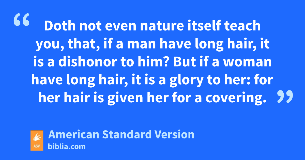 11 Be ye imitators of me, even as I also am of Christ. 2Now I praise you that ye remember me in all things, and hold fast the traditions, even as I delivered them to you. 3But I would have you know, that the head of every man is Christ; and the head of the woman is the man; and the head of Christ is God. 4Every man praying or prophesying, having his head covered, dishonoreth his head. 5But every woman praying or prophesying with her head unveiled dishonoreth her head; for it is one and the same thing as if she were shaven. 6For if a woman is not veiled, let her also be shorn: but if it is a shame to a woman to be shorn or shaven, let her be veiled. 7For a man indeed ought not to have his head veiled, forasmuch as he is the image and glory of God: but the woman is the glory of the man. 8For the man is not of the woman; but the woman of the man: 9for neither was the man created for the woman; but the woman for the man: 10for this cause ought the woman to have a sign of authority on her head, because of the angels. 11Nevertheless, neither is the woman without the man, nor the man without the woman, in the Lord. 12For as the woman is of the man, so is the man also by the woman; but all things are of God. 13Judge ye in yourselves: is it seemly that a woman pray unto God unveiled? 14Doth not even nature itself teach you, that, if a man have long hair, it is a dishonor to him? 15But if a woman have long hair, it is a glory to her: for her hair is given her for a covering. 16But if any man seemeth to be contentious, we have no such custom, neither the churches of God.