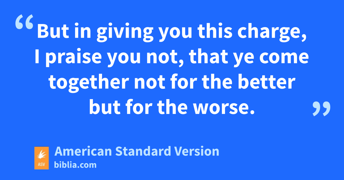 17But in giving you this charge, I praise you not, that ye come together not for the better but for the worse. 18For first of all, when ye come together in the church, I hear that divisions exist among you; and I partly believe it. 19For there must be also factions among you, that they that are approved may be made manifest among you. 20When therefore ye assemble yourselves together, it is not possible to eat the Lord’s supper: 21for in your eating each one taketh before other his own supper; and one is hungry, and another is drunken. 22What, have ye not houses to eat and to drink in? or despise ye the church of God, and put them to shame that have not? What shall I say to you? shall I praise you? In this I praise you not. 23For I received of the Lord that which also I delivered unto you, that the Lord Jesus in the night in which he was betrayed took bread; 24and when he had given thanks, he brake it, and said, This is my body, which is for you: this do in remembrance of me. 25In like manner also the cup, after supper, saying, This cup is the new covenant in my blood: this do, as often as ye drink it, in remembrance of me. 26For as often as ye eat this bread, and drink the cup, ye proclaim the Lord’s death till he come. 27Wherefore whosoever shall eat the bread or drink the cup of the Lord in an unworthy manner, shall be guilty of the body and the blood of the Lord. 28But let a man prove himself, and so let him eat of the bread, and drink of the cup. 29For he that eateth and drinketh, eateth and drinketh judgment unto himself, if he discern not the body. 30For this cause many among you are weak and sickly, and not a few sleep. 31But if we discerned ourselves, we should not be judged. 32But when we are judged, we are chastened of the Lord, that we may not be condemned with the world. 33Wherefore, my brethren, when ye come together to eat, wait one for another. 34If any man is hungry, let him eat at home; that your coming together be not unto judgment. And the rest will I set in order whensoever I come.