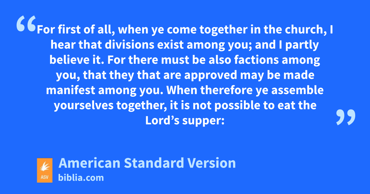 17But in giving you this charge, I praise you not, that ye come together not for the better but for the worse. 18For first of all, when ye come together in the church, I hear that divisions exist among you; and I partly believe it. 19For there must be also factions among you, that they that are approved may be made manifest among you. 20When therefore ye assemble yourselves together, it is not possible to eat the Lord’s supper: 21for in your eating each one taketh before other his own supper; and one is hungry, and another is drunken. 22What, have ye not houses to eat and to drink in? or despise ye the church of God, and put them to shame that have not? What shall I say to you? shall I praise you? In this I praise you not. 23For I received of the Lord that which also I delivered unto you, that the Lord Jesus in the night in which he was betrayed took bread; 24and when he had given thanks, he brake it, and said, This is my body, which is for you: this do in remembrance of me. 25In like manner also the cup, after supper, saying, This cup is the new covenant in my blood: this do, as often as ye drink it, in remembrance of me. 26For as often as ye eat this bread, and drink the cup, ye proclaim the Lord’s death till he come. 27Wherefore whosoever shall eat the bread or drink the cup of the Lord in an unworthy manner, shall be guilty of the body and the blood of the Lord. 28But let a man prove himself, and so let him eat of the bread, and drink of the cup. 29For he that eateth and drinketh, eateth and drinketh judgment unto himself, if he discern not the body. 30For this cause many among you are weak and sickly, and not a few sleep. 31But if we discerned ourselves, we should not be judged. 32But when we are judged, we are chastened of the Lord, that we may not be condemned with the world. 33Wherefore, my brethren, when ye come together to eat, wait one for another. 34If any man is hungry, let him eat at home; that your coming together be not unto judgment. And the rest will I set in order whensoever I come.