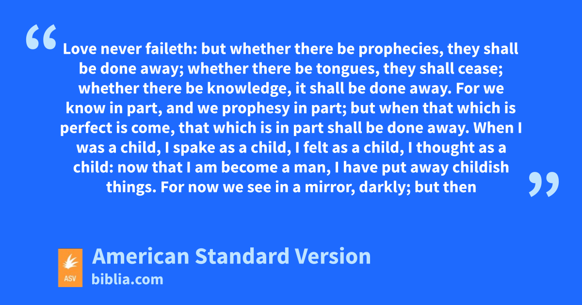 13 If I speak with the tongues of men and of angels, but have not love, I am become sounding brass, or a clanging cymbal. 2And if I have the gift of prophecy, and know all mysteries and all knowledge; and if I have all faith, so as to remove mountains, but have not love, I am nothing. 3And if I bestow all my goods to feed the poor, and if I give my body to be burned, but have not love, it profiteth me nothing. 4Love suffereth long, and is kind; love envieth not; love vaunteth not itself, is not puffed up, 5doth not behave itself unseemly, seeketh not its own, is not provoked, taketh not account of evil; 6rejoiceth not in unrighteousness, but rejoiceth with the truth; 7beareth all things, believeth all things, hopeth all things, endureth all things. 8Love never faileth: but whether there be prophecies, they shall be done away; whether there be tongues, they shall cease; whether there be knowledge, it shall be done away. 9For we know in part, and we prophesy in part; 10but when that which is perfect is come, that which is in part shall be done away. 11When I was a child, I spake as a child, I felt as a child, I thought as a child: now that I am become a man, I have put away childish things. 12For now we see in a mirror, darkly; but then face to face: now I know in part; but then shall I know fully even as also I was fully known. 13But now abideth faith, hope, love, these three; and the greatest of these is love.