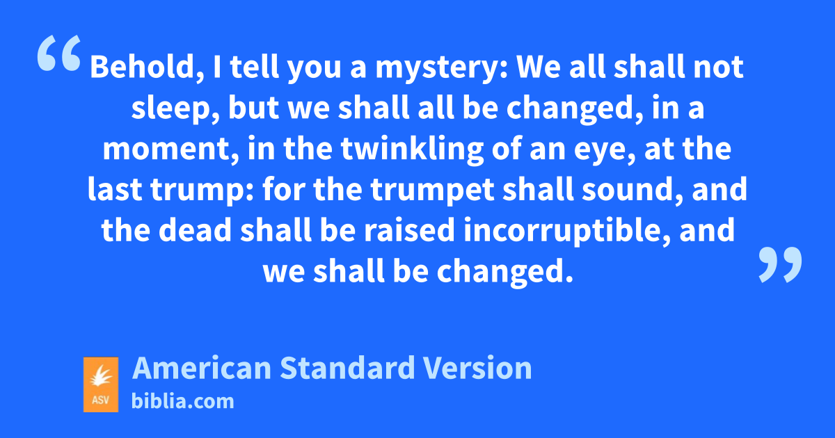 50Now this I say, brethren, that flesh and blood cannot inherit the kingdom of God; neither doth corruption inherit incorruption. 51Behold, I tell you a mystery: We all shall not sleep, but we shall all be changed, 52in a moment, in the twinkling of an eye, at the last trump: for the trumpet shall sound, and the dead shall be raised incorruptible, and we shall be changed. 53For this corruptible must put on incorruption, and this mortal must put on immortality. 54But when this corruptible shall have put on incorruption, and this mortal shall have put on immortality, then shall come to pass the saying that is written, Death is swallowed up in victory. 55O death, where is thy victory? O death, where is thy sting? 56The sting of death is sin; and the power of sin is the law: 57but thanks be to God, who giveth us the victory through our Lord Jesus Christ. 58Wherefore, my beloved brethren, be ye stedfast, unmoveable, always abounding in the work of the Lord, forasmuch as ye know that your labor is not vain in the Lord.