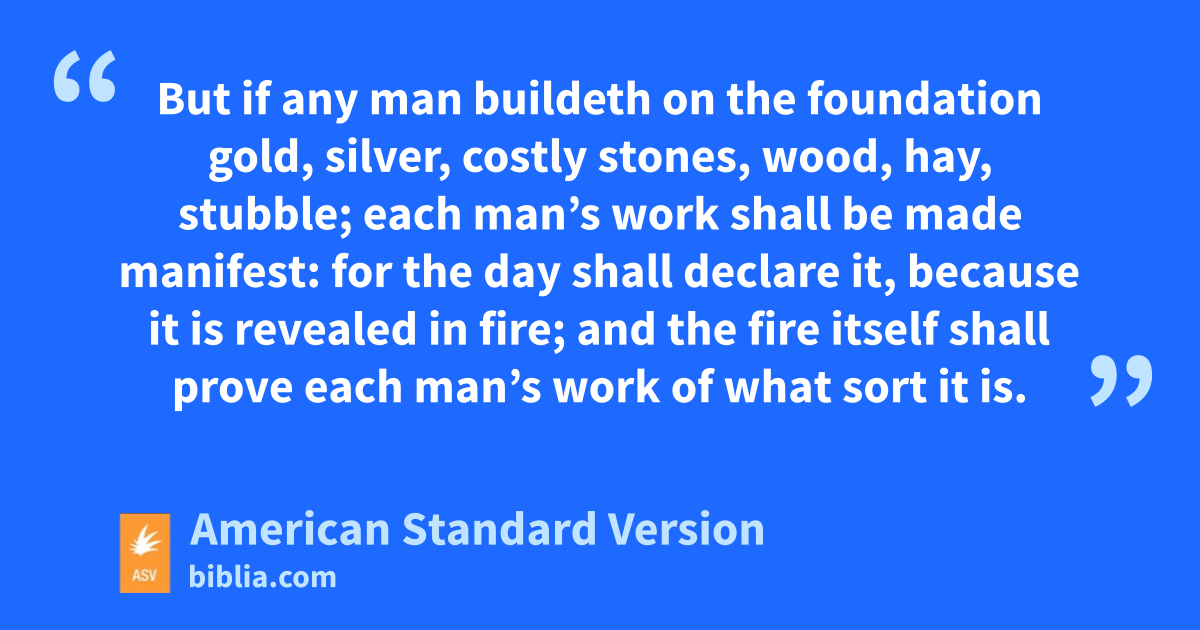 10According to the grace of God which was given unto me, as a wise masterbuilder I laid a foundation; and another buildeth thereon. But let each man take heed how he buildeth thereon. 11For other foundation can no man lay than that which is laid, which is Jesus Christ. 12But if any man buildeth on the foundation gold, silver, costly stones, wood, hay, stubble; 13each man’s work shall be made manifest: for the day shall declare it, because it is revealed in fire; and the fire itself shall prove each man’s work of what sort it is. 14If any man’s work shall abide which he built thereon, he shall receive a reward. 15If any man’s work shall be burned, he shall suffer loss: but he himself shall be saved; yet so as through fire.