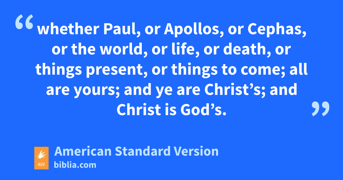 18Let no man deceive himself. If any man thinketh that he is wise among you in this world, let him become a fool, that he may become wise. 19For the wisdom of this world is foolishness with God. For it is written, He that taketh the wise in their craftiness: 20and again, The Lord knoweth the reasonings of the wise, that they are vain. 21Wherefore let no one glory in men. For all things are yours; 22whether Paul, or Apollos, or Cephas, or the world, or life, or death, or things present, or things to come; all are yours; 23and ye are Christ’s; and Christ is God’s.