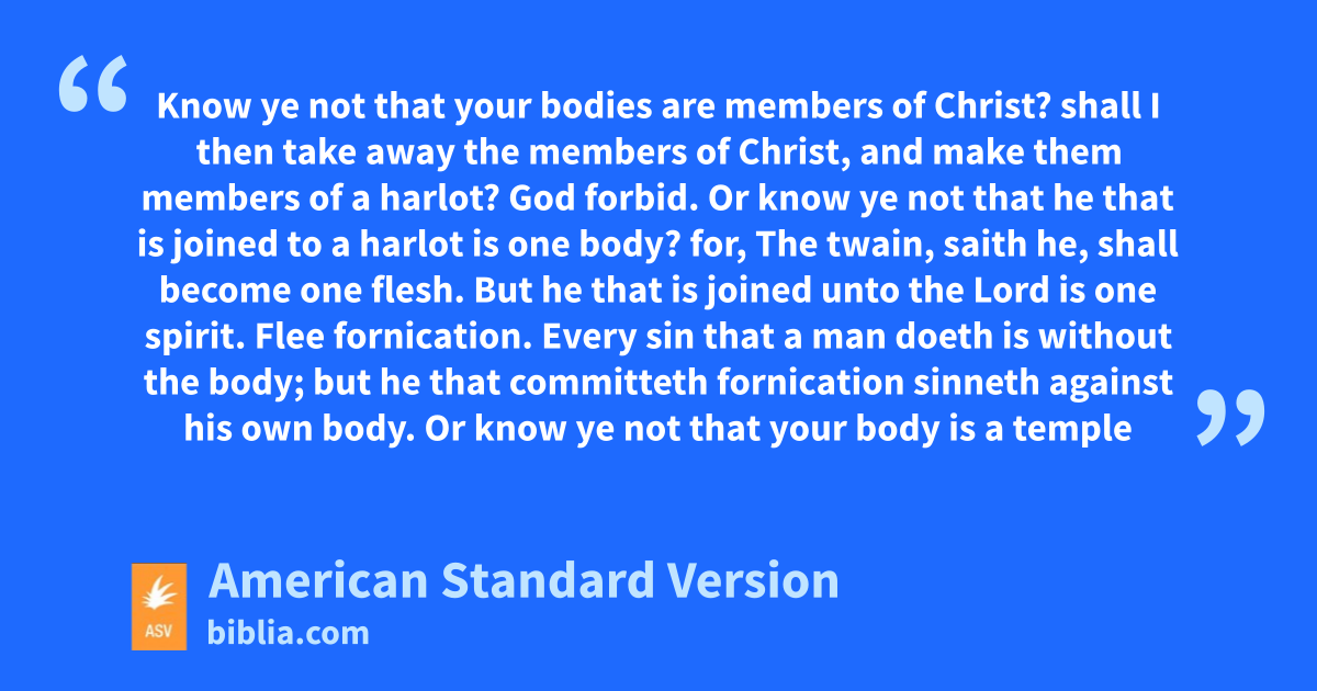 12All things are lawful for me; but not all things are expedient. All things are lawful for me; but I will not be brought under the power of any. 13Meats for the belly, and the belly for meats: but God shall bring to nought both it and them. But the body is not for fornication, but for the Lord; and the Lord for the body: 14and God both raised the Lord, and will raise up us through his power. 15Know ye not that your bodies are members of Christ? shall I then take away the members of Christ, and make them members of a harlot? God forbid. 16Or know ye not that he that is joined to a harlot is one body? for, The twain, saith he, shall become one flesh. 17But he that is joined unto the Lord is one spirit. 18Flee fornication. Every sin that a man doeth is without the body; but he that committeth fornication sinneth against his own body. 19Or know ye not that your body is a temple of the Holy Spirit which is in you, which ye have from God? and ye are not your own; 20for ye were bought with a price: glorify God therefore in your body.