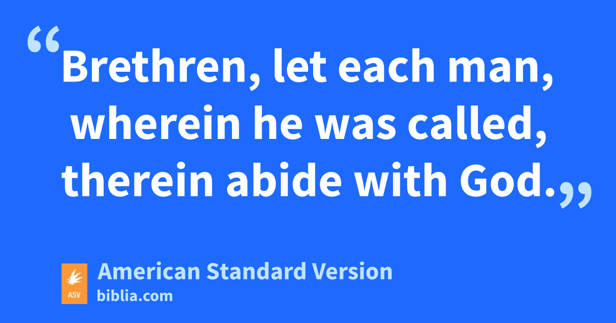8But I say to the unmarried and to widows, It is good for them if they abide even as I. 9But if they have not continency, let them marry: for it is better to marry than to burn. 10But unto the married I give charge, yea not I, but the Lord, That the wife depart not from her husband 11(but should she depart, let her remain unmarried, or else be reconciled to her husband); and that the husband leave not his wife. 12But to the rest say I, not the Lord: If any brother hath an unbelieving wife, and she is content to dwell with him, let him not leave her. 13And the woman that hath an unbelieving husband, and he is content to dwell with her, let her not leave her husband. 14For the unbelieving husband is sanctified in the wife, and the unbelieving wife is sanctified in the brother: else were your children unclean; but now are they holy. 15Yet if the unbelieving departeth, let him depart: the brother or the sister is not under bondage in such cases: but God hath called us in peace. 16For how knowest thou, O wife, whether thou shalt save thy husband? or how knowest thou, O husband, whether thou shalt save thy wife? 17Only, as the Lord hath distributed to each man, as God hath called each, so let him walk. And so ordain I in all the churches. 18Was any man called being circumcised? let him not become uncircumcised. Hath any been called in uncircumcision? let him not be circumcised. 19Circumcision is nothing, and uncircumcision is nothing; but the keeping of the commandments of God. 20Let each man abide in that calling wherein he was called. 21Wast thou called being a bondservant? care not for it: nay, even if thou canst become free, use it rather. 22For he that was called in the Lord being a bondservant, is the Lord’s freedman: likewise he that was called being free, is Christ’s bondservant. 23Ye were bought with a price; become not bondservants of men. 24Brethren, let each man, wherein he was called, therein abide with God.