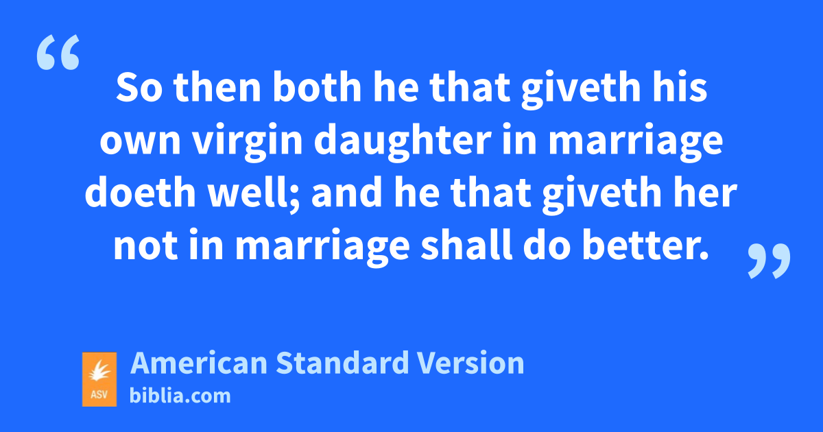 25Now concerning virgins I have no commandment of the Lord: but I give my judgment, as one that hath obtained mercy of the Lord to be trustworthy. 26I think therefore that this is good by reason of the distress that is upon us, namely, that it is good for a man to be as he is. 27Art thou bound unto a wife? seek not to be loosed. Art thou loosed from a wife? seek not a wife. 28But shouldest thou marry, thou hast not sinned; and if a virgin marry, she hath not sinned. Yet such shall have tribulation in the flesh: and I would spare you. 29But this I say, brethren, the time is shortened, that henceforth both those that have wives may be as though they had none; 30and those that weep, as though they wept not; and those that rejoice, as though they rejoiced not; and those that buy, as though they possessed not; 31and those that use the world, as not using it to the full: for the fashion of this world passeth away. 32But I would have you to be free from cares. He that is unmarried is careful for the things of the Lord, how he may please the Lord: 33but he that is married is careful for the things of the world, how he may please his wife, 34and is divided. So also the woman that is unmarried and the virgin is careful for the things of the Lord, that she may be holy both in body and in spirit: but she that is married is careful for the things of the world, how she may please her husband. 35And this I say for your own profit; not that I may cast a snare upon you, but for that which is seemly, and that ye may attend upon the Lord without distraction. 36But if any man thinketh that he behaveth himself unseemly toward his virgin daughter, if she be past the flower of her age, and if need so requireth, let him do what he will; he sinneth not; let them marry. 37But he that standeth stedfast in his heart, having no necessity, but hath power as touching his own will, and hath determined this in his own heart, to keep his own virgin daughter, shall do well. 38So then both he that giveth his own virgin daughter in marriage doeth well; and he that giveth her not in marriage shall do better. 39A wife is bound for so long time as her husband liveth; but if the husband be dead, she is free to be married to whom she will; only in the Lord. 40But she is happier if she abide as she is, after my judgment: and I think that I also have the Spirit of God.