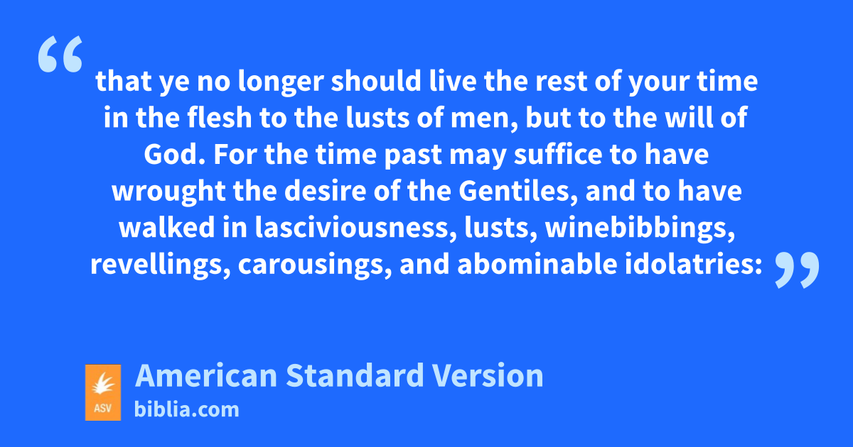 4 Forasmuch then as Christ suffered in the flesh, arm ye yourselves also with the same mind; for he that hath suffered in the flesh hath ceased from sin; 2that ye no longer should live the rest of your time in the flesh to the lusts of men, but to the will of God. 3For the time past may suffice to have wrought the desire of the Gentiles, and to have walked in lasciviousness, lusts, winebibbings, revellings, carousings, and abominable idolatries: 4wherein they think it strange that ye run not with them into the same excess of riot, speaking evil of you: 5who shall give account to him that is ready to judge the living and the dead. 6For unto this end was the gospel preached even to the dead, that they might be judged indeed according to men in the flesh, but live according to God in the spirit.