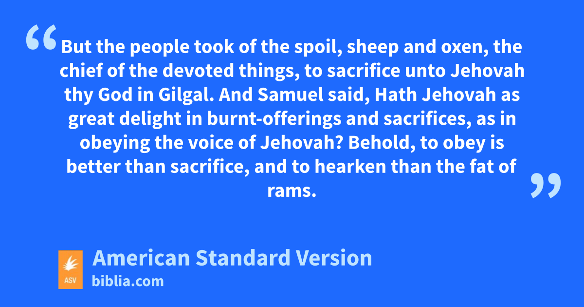 17And Samuel said, Though thou wast little in thine own sight, wast thou not made the head of the tribes of Israel? And Jehovah anointed thee king over Israel; 18and Jehovah sent thee on a journey, and said, Go, and utterly destroy the sinners the Amalekites, and fight against them until they be consumed. 19Wherefore then didst thou not obey the voice of Jehovah, but didst fly upon the spoil, and didst that which was evil in the sight of Jehovah? 20And Saul said unto Samuel, Yea, I have obeyed the voice of Jehovah, and have gone the way which Jehovah sent me, and have brought Agag the king of Amalek, and have utterly destroyed the Amalekites. 21But the people took of the spoil, sheep and oxen, the chief of the devoted things, to sacrifice unto Jehovah thy God in Gilgal. 22And Samuel said, Hath Jehovah as great delight in burnt-offerings and sacrifices, as in obeying the voice of Jehovah? Behold, to obey is better than sacrifice, and to hearken than the fat of rams. 23For rebellion is as the sin of witchcraft, and stubbornness is as idolatry and teraphim. Because thou hast rejected the word of Jehovah, he hath also rejected thee from being king.