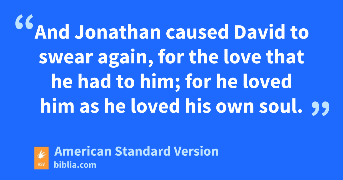 17And Jonathan caused David to swear again, for the love that he had to him; for he loved him as he loved his own soul. 18Then Jonathan said unto him, To-morrow is the new moon: and thou wilt be missed, because thy seat will be empty. 19And when thou hast stayed three days, thou shalt go down quickly, and come to the place where thou didst hide thyself when the business was in hand, and shalt remain by the stone Ezel. 20And I will shoot three arrows on the side thereof, as though I shot at a mark. 21And, behold, I will send the lad, saying, Go, find the arrows. If I say unto the lad, Behold, the arrows are on this side of thee; take them, and come; for there is peace to thee and no hurt, as Jehovah liveth. 22But if I say thus unto the boy, Behold, the arrows are beyond thee; go thy way; for Jehovah hath sent thee away. 23And as touching the matter which thou and I have spoken of, behold, Jehovah is between thee and me for ever.