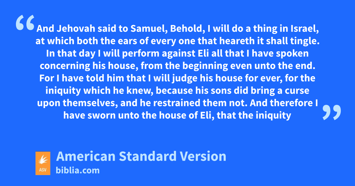 10And Jehovah came, and stood, and called as at other times, Samuel, Samuel. Then Samuel said, Speak; for thy servant heareth. 11And Jehovah said to Samuel, Behold, I will do a thing in Israel, at which both the ears of every one that heareth it shall tingle. 12In that day I will perform against Eli all that I have spoken concerning his house, from the beginning even unto the end. 13For I have told him that I will judge his house for ever, for the iniquity which he knew, because his sons did bring a curse upon themselves, and he restrained them not. 14And therefore I have sworn unto the house of Eli, that the iniquity of Eli’s house shall not be expiated with sacrifice nor offering for ever.
