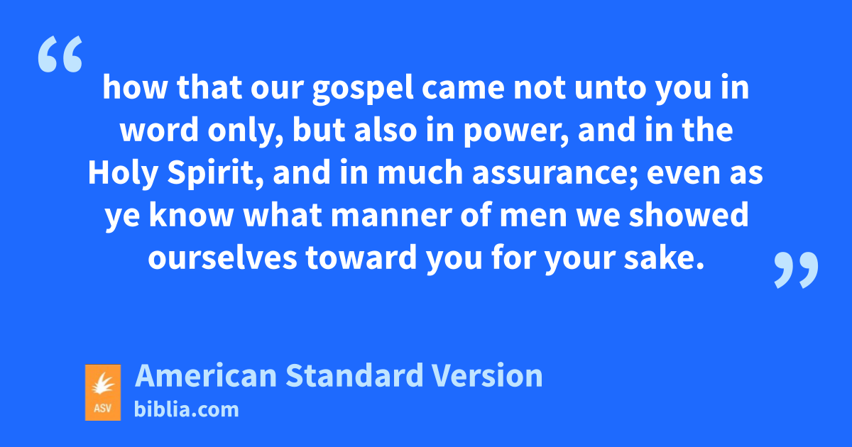 2We give thanks to God always for you all, making mention of you in our prayers; 3remembering without ceasing your work of faith and labor of love and patience of hope in our Lord Jesus Christ, before our God and Father; 4knowing, brethren beloved of God, your election, 5how that our gospel came not unto you in word only, but also in power, and in the Holy Spirit, and in much assurance; even as ye know what manner of men we showed ourselves toward you for your sake. 6And ye became imitators of us, and of the Lord, having received the word in much affliction, with joy of the Holy Spirit; 7so that ye became an ensample to all that believe in Macedonia and in Achaia. 8For from you hath sounded forth the word of the Lord, not only in Macedonia and Achaia, but in every place your faith to God-ward is gone forth; so that we need not to speak anything. 9For they themselves report concerning us what manner of entering in we had unto you; and how ye turned unto God from idols, to serve a living and true God, 10and to wait for his Son from heaven, whom he raised from the dead, even Jesus, who delivereth us from the wrath to come.