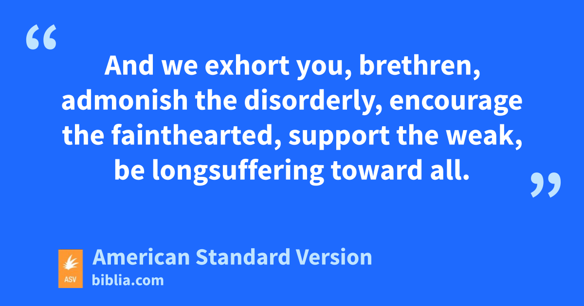 12But we beseech you, brethren, to know them that labor among you, and are over you in the Lord, and admonish you; 13and to esteem them exceeding highly in love for their work’s sake. Be at peace among yourselves. 14And we exhort you, brethren, admonish the disorderly, encourage the fainthearted, support the weak, be longsuffering toward all. 15See that none render unto any one evil for evil; but always follow after that which is good, one toward another, and toward all. 16Rejoice always; 17pray without ceasing; 18in everything give thanks: for this is the will of God in Christ Jesus to you-ward. 19Quench not the Spirit; 20despise not prophesyings; 21prove all things; hold fast that which is good; 22abstain from every form of evil.