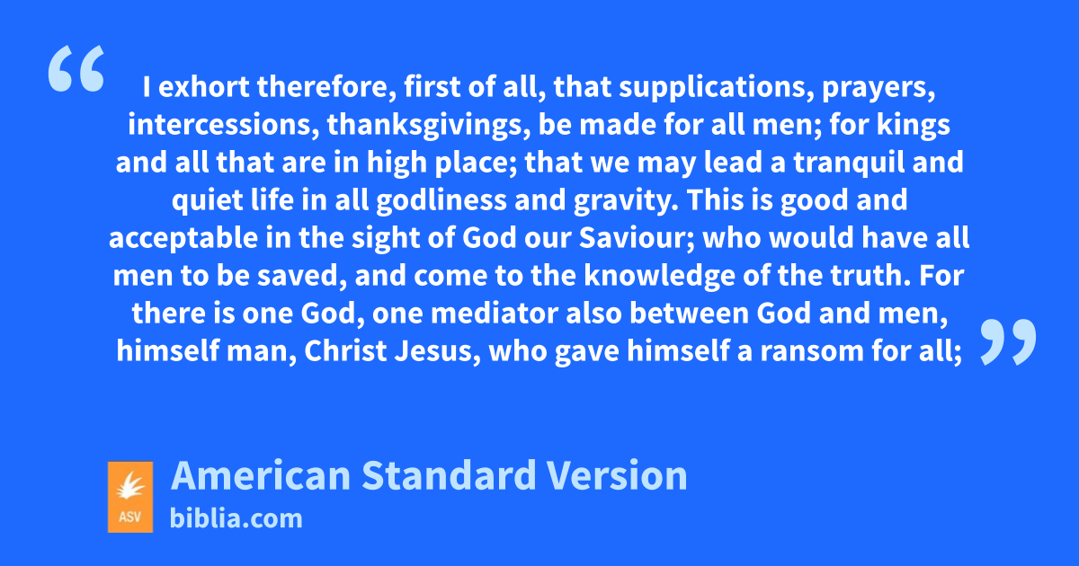 2 I exhort therefore, first of all, that supplications, prayers, intercessions, thanksgivings, be made for all men; 2for kings and all that are in high place; that we may lead a tranquil and quiet life in all godliness and gravity. 3This is good and acceptable in the sight of God our Saviour; 4who would have all men to be saved, and come to the knowledge of the truth. 5For there is one God, one mediator also between God and men, himself man, Christ Jesus, 6who gave himself a ransom for all; the testimony to be borne in its own times; 7whereunto I was appointed a preacher and an apostle (I speak the truth, I lie not), a teacher of the Gentiles in faith and truth.