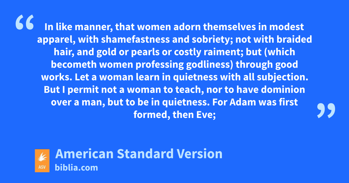 8I desire therefore that the men pray in every place, lifting up holy hands, without wrath and disputing. 9In like manner, that women adorn themselves in modest apparel, with shamefastness and sobriety; not with braided hair, and gold or pearls or costly raiment; 10but (which becometh women professing godliness) through good works. 11Let a woman learn in quietness with all subjection. 12But I permit not a woman to teach, nor to have dominion over a man, but to be in quietness. 13For Adam was first formed, then Eve; 14and Adam was not beguiled, but the woman being beguiled hath fallen into transgression: 15but she shall be saved through her child-bearing, if they continue in faith and love and sanctification with sobriety.
