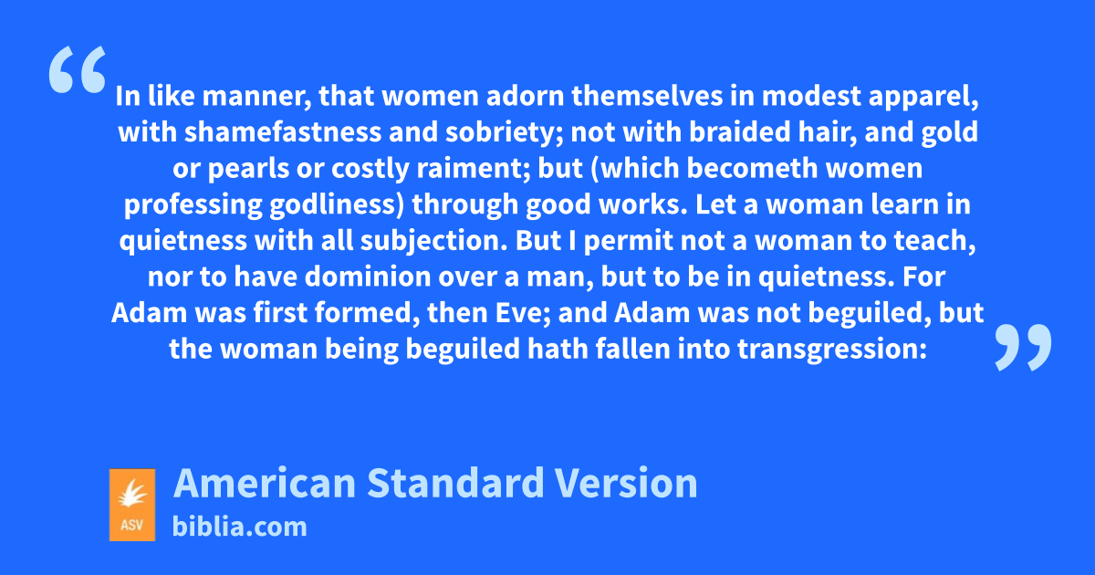 8I desire therefore that the men pray in every place, lifting up holy hands, without wrath and disputing. 9In like manner, that women adorn themselves in modest apparel, with shamefastness and sobriety; not with braided hair, and gold or pearls or costly raiment; 10but (which becometh women professing godliness) through good works. 11Let a woman learn in quietness with all subjection. 12But I permit not a woman to teach, nor to have dominion over a man, but to be in quietness. 13For Adam was first formed, then Eve; 14and Adam was not beguiled, but the woman being beguiled hath fallen into transgression: 15but she shall be saved through her child-bearing, if they continue in faith and love and sanctification with sobriety.