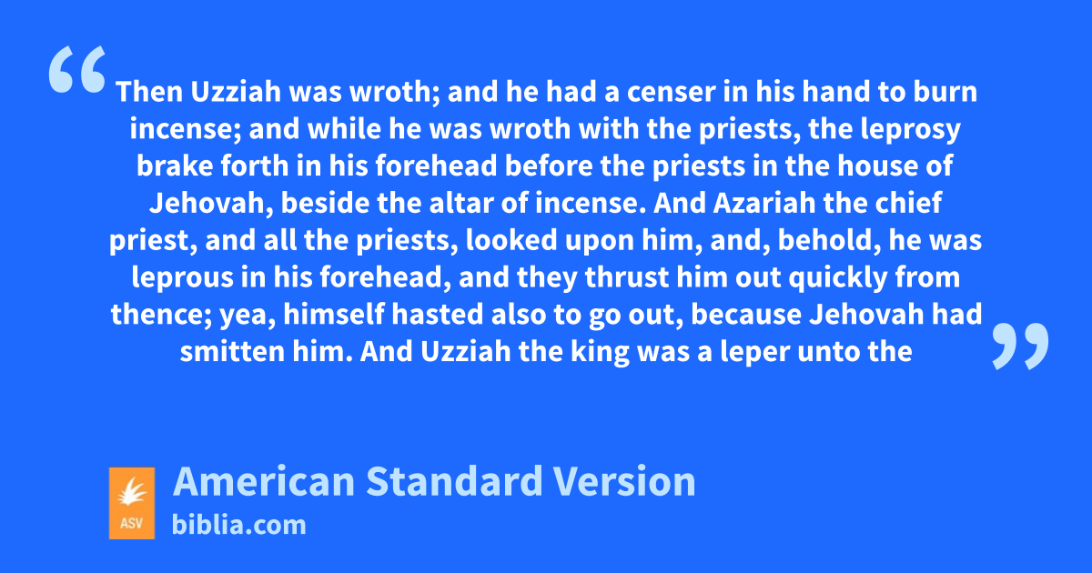16But when he was strong, his heart was lifted up, so that he did corruptly, and he trespassed against Jehovah his God; for he went into the temple of Jehovah to burn incense upon the altar of incense. 17And Azariah the priest went in after him, and with him fourscore priests of Jehovah, that were valiant men: 18and they withstood Uzziah the king, and said unto him, It pertaineth not unto thee, Uzziah, to burn incense unto Jehovah, but to the priests the sons of Aaron, that are consecrated to burn incense: go out of the sanctuary; for thou hast trespassed; neither shall it be for thine honor from Jehovah God. 19Then Uzziah was wroth; and he had a censer in his hand to burn incense; and while he was wroth with the priests, the leprosy brake forth in his forehead before the priests in the house of Jehovah, beside the altar of incense. 20And Azariah the chief priest, and all the priests, looked upon him, and, behold, he was leprous in his forehead, and they thrust him out quickly from thence; yea, himself hasted also to go out, because Jehovah had smitten him. 21And Uzziah the king was a leper unto the day of his death, and dwelt in a separate house, being a leper; for he was cut off from the house of Jehovah: and Jotham his son was over the king’s house, judging the people of the land. 22Now the rest of the acts of Uzziah, first and last, did Isaiah the prophet, the son of Amoz, write. 23So Uzziah slept with his fathers; and they buried him with his fathers in the field of burial which belonged to the kings; for they said, He is a leper: and Jotham his son reigned in his stead.