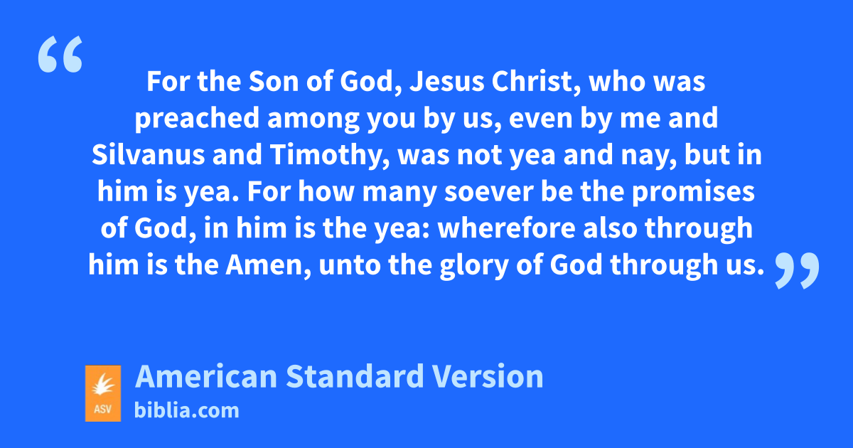 15And in this confidence I was minded to come first unto you, that ye might have a second benefit; 16and by you to pass into Macedonia, and again from Macedonia to come unto you, and of you to be set forward on my journey unto Judaea. 17When I therefore was thus minded, did I show fickleness? or the things that I purpose, do I purpose according to the flesh, that with me there should be the yea yea and the nay nay? 18But as God is faithful, our word toward you is not yea and nay. 19For the Son of God, Jesus Christ, who was preached among you by us, even by me and Silvanus and Timothy, was not yea and nay, but in him is yea. 20For how many soever be the promises of God, in him is the yea: wherefore also through him is the Amen, unto the glory of God through us. 21Now he that establisheth us with you in Christ, and anointed us, is God; 22who also sealed us, and gave us the earnest of the Spirit in our hearts.