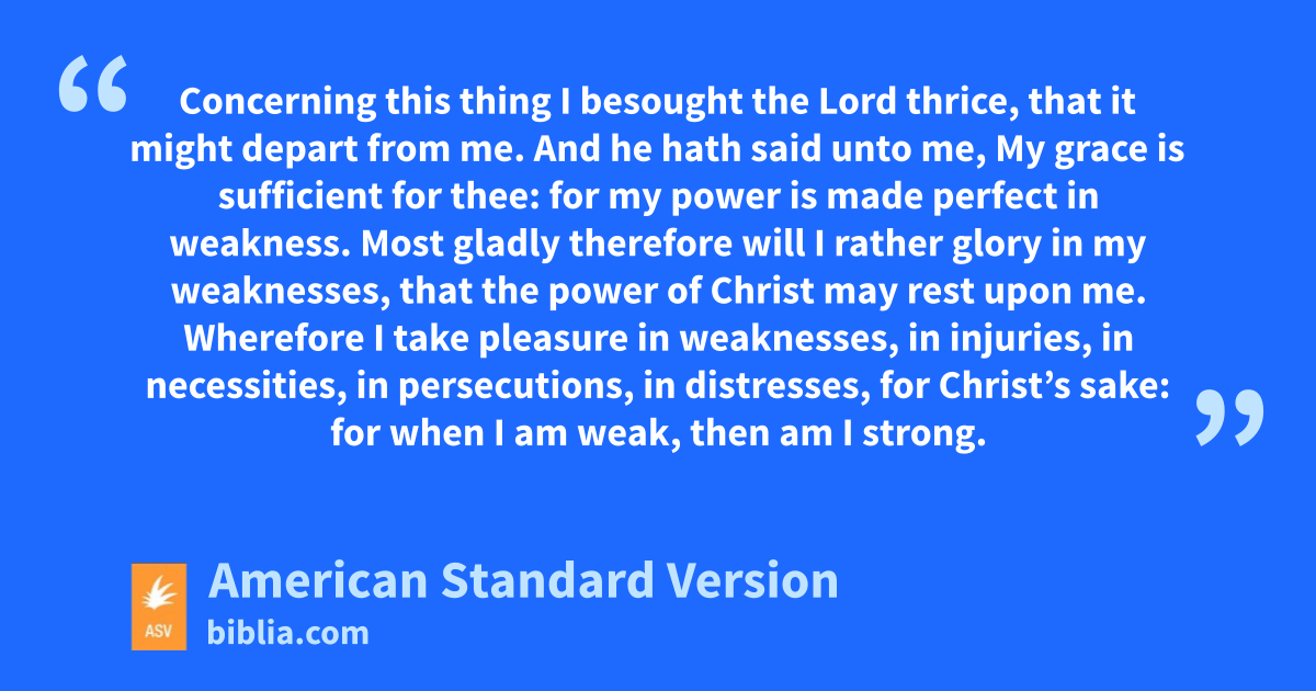 12 I must needs glory, though it is not expedient; but I will come to visions and revelations of the Lord. 2I know a man in Christ, fourteen years ago (whether in the body, I know not; or whether out of the body, I know not; God knoweth), such a one caught up even to the third heaven. 3And I know such a man (whether in the body, or apart from the body, I know not; God knoweth), 4how that he was caught up into Paradise, and heard unspeakable words, which it is not lawful for a man to utter. 5On behalf of such a one will I glory: but on mine own behalf I will not glory, save in my weaknesses. 6For if I should desire to glory, I shall not be foolish; for I shall speak the truth: but I forbear, lest any man should account of me above that which he seeth me to be, or heareth from me. 7And by reason of the exceeding greatness of the revelations, that I should not be exalted overmuch, there was given to me a thorn in the flesh, a messenger of Satan to buffet me, that I should not be exalted overmuch. 8Concerning this thing I besought the Lord thrice, that it might depart from me. 9And he hath said unto me, My grace is sufficient for thee: for my power is made perfect in weakness. Most gladly therefore will I rather glory in my weaknesses, that the power of Christ may rest upon me. 10Wherefore I take pleasure in weaknesses, in injuries, in necessities, in persecutions, in distresses, for Christ’s sake: for when I am weak, then am I strong.