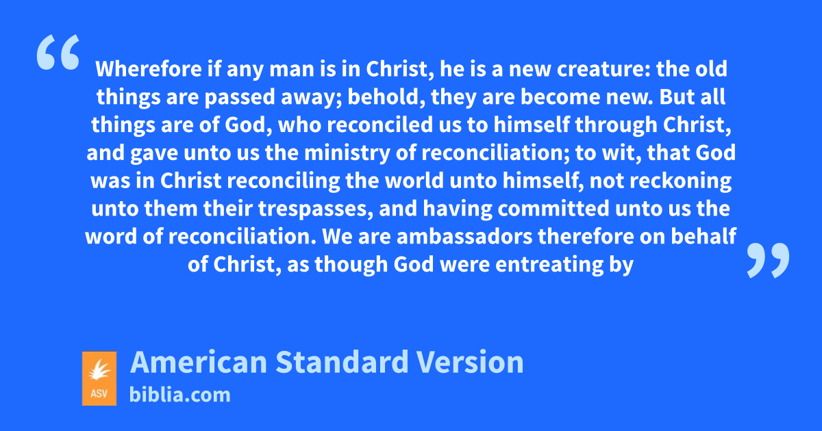 11Knowing therefore the fear of the Lord, we persuade men, but we are made manifest unto God; and I hope that we are made manifest also in your consciences. 12We are not again commending ourselves unto you, but speak as giving you occasion of glorying on our behalf, that ye may have wherewith to answer them that glory in appearance, and not in heart. 13For whether we are beside ourselves, it is unto God; or whether we are of sober mind, it is unto you. 14For the love of Christ constraineth us; because we thus judge, that one died for all, therefore all died; 15and he died for all, that they that live should no longer live unto themselves, but unto him who for their sakes died and rose again. 16Wherefore we henceforth know no man after the flesh: even though we have known Christ after the flesh, yet now we know him so no more. 17Wherefore if any man is in Christ, he is a new creature: the old things are passed away; behold, they are become new. 18But all things are of God, who reconciled us to himself through Christ, and gave unto us the ministry of reconciliation; 19to wit, that God was in Christ reconciling the world unto himself, not reckoning unto them their trespasses, and having committed unto us the word of reconciliation.