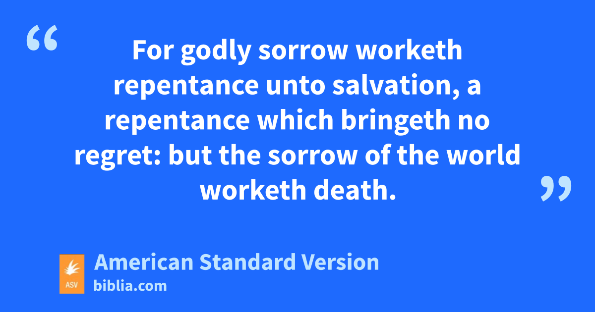 5For even when we were come into Macedonia our flesh had no relief, but we were afflicted on every side; without were fightings, within were fears. 6Nevertheless he that comforteth the lowly, even God, comforted us by the coming of Titus; 7and not by his coming only, but also by the comfort wherewith he was comforted in you, while he told us your longing, your mourning, your zeal for me; so that I rejoiced yet more. 8For though I made you sorry with my epistle, I do not regret it: though I did regret it (for I see that that epistle made you sorry, though but for a season), 9I now rejoice, not that ye were made sorry, but that ye were made sorry unto repentance; for ye were made sorry after a godly sort, that ye might suffer loss by us in nothing. 10For godly sorrow worketh repentance unto salvation, a repentance which bringeth no regret: but the sorrow of the world worketh death. 11For behold, this selfsame thing, that ye were made sorry after a godly sort, what earnest care it wrought in you, yea what clearing of yourselves, yea what indignation, yea what fear, yea what longing, yea what zeal, yea what avenging! In everything ye approved yourselves to be pure in the matter. 12So although I wrote unto you, I wrote not for his cause that did the wrong, nor for his cause that suffered the wrong, but that your earnest care for us might be made manifest unto you in the sight of God. 13Therefore we have been comforted: and in our comfort we joyed the more exceedingly for the joy of Titus, because his spirit hath been refreshed by you all. 14For if in anything I have gloried to him on your behalf, I was not put to shame; but as we spake all things to you in truth, so our glorying also which I made before Titus was found to be truth. 15And his affection is more abundantly toward you, while he remembereth the obedience of you all, how with fear and trembling ye received him. 16I rejoice that in everything I am of good courage concerning you.