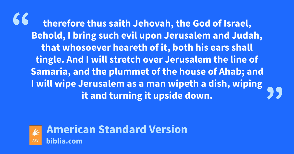 10And Jehovah spake by his servants the prophets, saying, 11Because Manasseh king of Judah hath done these abominations, and hath done wickedly above all that the Amorites did, that were before him, and hath made Judah also to sin with his idols; 12therefore thus saith Jehovah, the God of Israel, Behold, I bring such evil upon Jerusalem and Judah, that whosoever heareth of it, both his ears shall tingle. 13And I will stretch over Jerusalem the line of Samaria, and the plummet of the house of Ahab; and I will wipe Jerusalem as a man wipeth a dish, wiping it and turning it upside down. 14And I will cast off the remnant of mine inheritance, and deliver them into the hand of their enemies; and they shall become a prey and a spoil to all their enemies; 15because they have done that which is evil in my sight, and have provoked me to anger, since the day their fathers came forth out of Egypt, even unto this day.