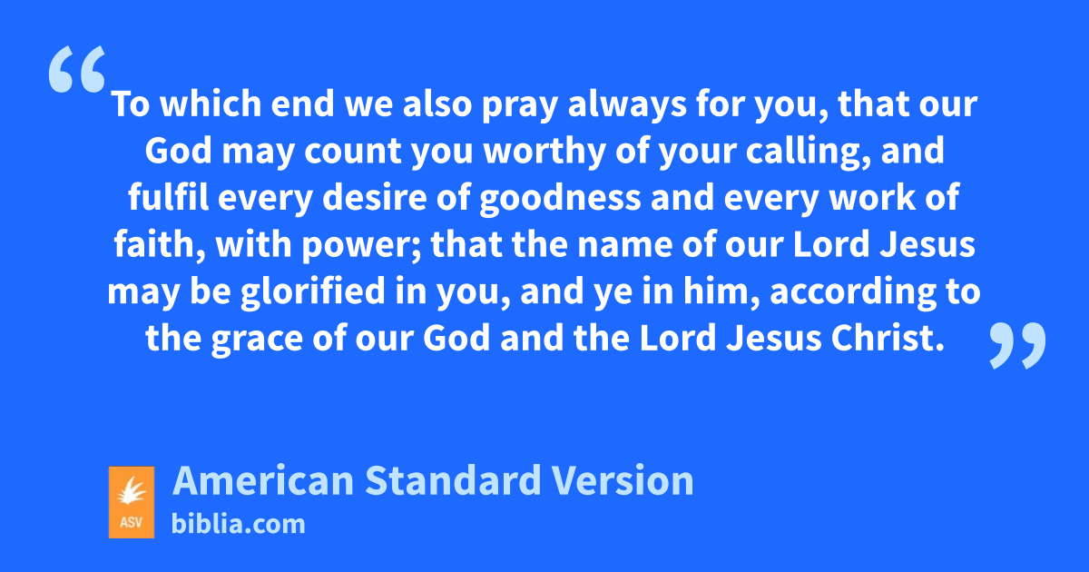3We are bound to give thanks to God always for you, brethren, even as it is meet, for that your faith groweth exceedingly, and the love of each one of you all toward one another aboundeth; 4so that we ourselves glory in you in the churches of God for your patience and faith in all your persecutions and in the afflictions which ye endure; 5which is a manifest token of the righteous judgment of God; to the end that ye may be counted worthy of the kingdom of God, for which ye also suffer: 6if so be that it is a righteous thing with God to recompense affliction to them that afflict you, 7and to you that are afflicted rest with us, at the revelation of the Lord Jesus from heaven with the angels of his power in flaming fire, 8rendering vengeance to them that know not God, and to them that obey not the gospel of our Lord Jesus: 9who shall suffer punishment, even eternal destruction from the face of the Lord and from the glory of his might, 10when he shall come to be glorified in his saints, and to be marvelled at in all them that believed (because our testimony unto you was believed) in that day. 11To which end we also pray always for you, that our God may count you worthy of your calling, and fulfil every desire of goodness and every work of faith, with power; 12that the name of our Lord Jesus may be glorified in you, and ye in him, according to the grace of our God and the Lord Jesus Christ.