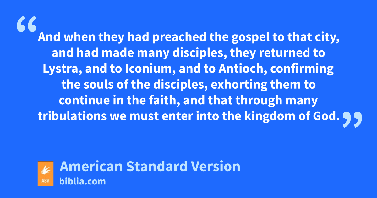 19But there came Jews thither from Antioch and Iconium: and having persuaded the multitudes, they stoned Paul, and dragged him out of the city, supposing that he was dead. 20But as the disciples stood round about him, he rose up, and entered into the city: and on the morrow he went forth with Barnabas to Derbe. 21And when they had preached the gospel to that city, and had made many disciples, they returned to Lystra, and to Iconium, and to Antioch, 22confirming the souls of the disciples, exhorting them to continue in the faith, and that through many tribulations we must enter into the kingdom of God. 23And when they had appointed for them elders in every church, and had prayed with fasting, they commended them to the Lord, on whom they had believed. 24And they passed through Pisidia, and came to Pamphylia. 25And when they had spoken the word in Perga, they went down to Attalia; 26and thence they sailed to Antioch, from whence they had been committed to the grace of God for the work which they had fulfilled. 27And when they were come, and had gathered the church together, they rehearsed all things that God had done with them, and that he had opened a door of faith unto the Gentiles. 28And they tarried no little time with the disciples.